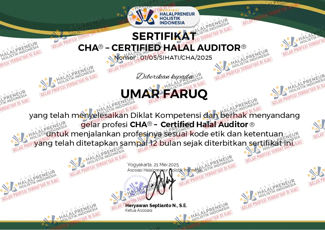 CHA® juga telah memiliki sertifikasi Sertifikat Kompetensi Profesi dari BNSP sesuai dengan SKKNI Auditor Halal.